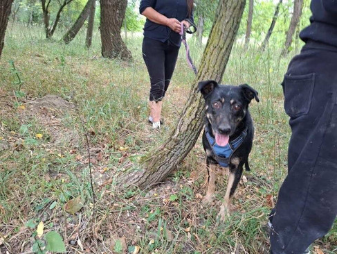 She’s food‑motivated and attentive, which makes her a joy to train. She’s had practice with a harness and lead alongside the shelter team and other dogs, and with gentle guidance at home she’ll continue to grow in confidence.