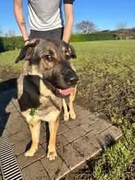 She accepts a collar, harness and lead. She can pull when on the lead as she is very interested in her surroundings. She may bark and lunge at dogs, cats or people so please be aware of this. She is a little boisterous but is brilliant with older kids 13+